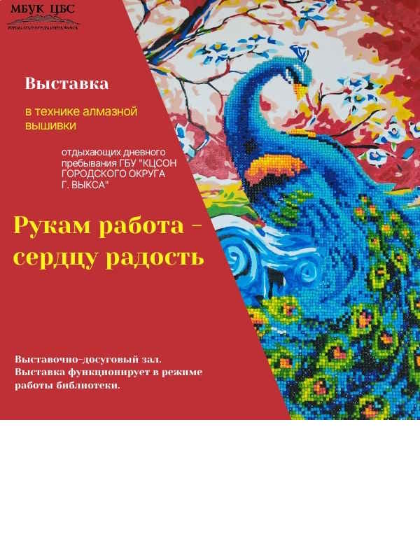 В начале октября 2025 года в рамках Декады пожилого человека в Центральной библиотеке (м-н Центральный, 20) открылась выставка работ в технике алмазной вышивки «Рукам работа – сердцу радость» отдыхающих отделения дневного пребывания под руководством инструктора по трудотерапии Сигуновой С.В.